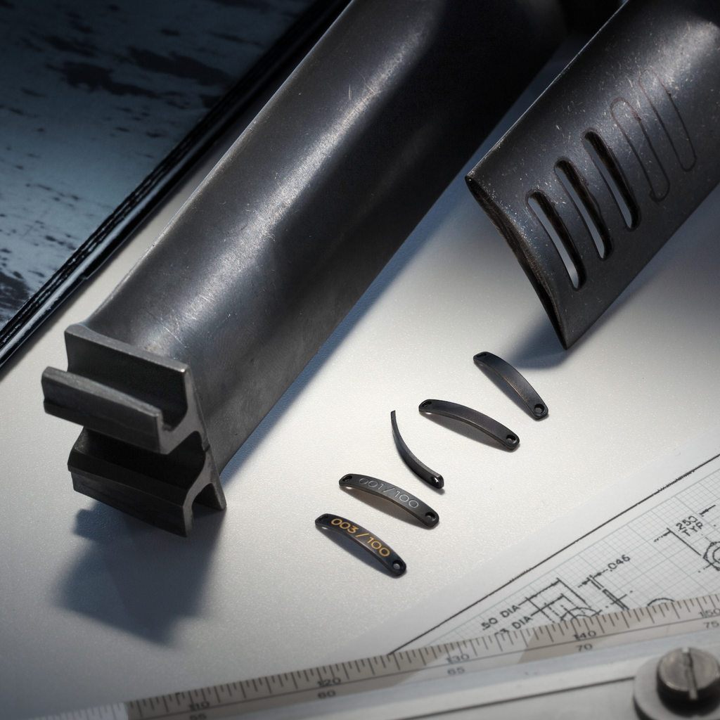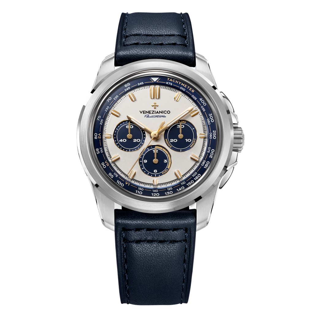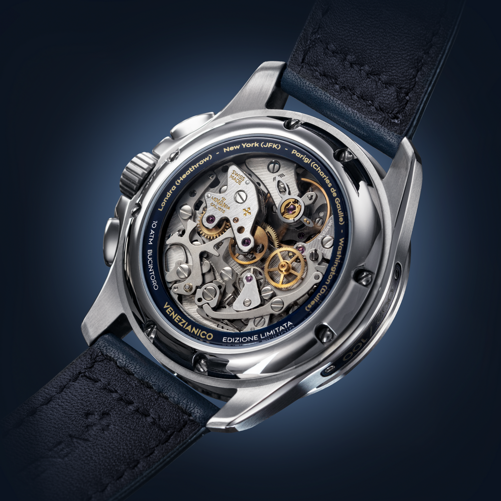 The Bucintoro 1976 represents the second chapter in our series dedicated to NOS movements, precious witnesses of the great mechanical tradition. Beating at its heart is the vintage Lemania 1873 calibre, a hand-wound chronograph that once powered professional aviation instruments, a true symbol of reliability and precision. This edition pays tribute to the era when civil supersonic aviation reshaped the boundaries of travel, turning the ocean into just a few hours of flight. To seal this bond, each timepiece houses a certified titanium plaque crafted from an original Concorde engine blade, making every watch unique.